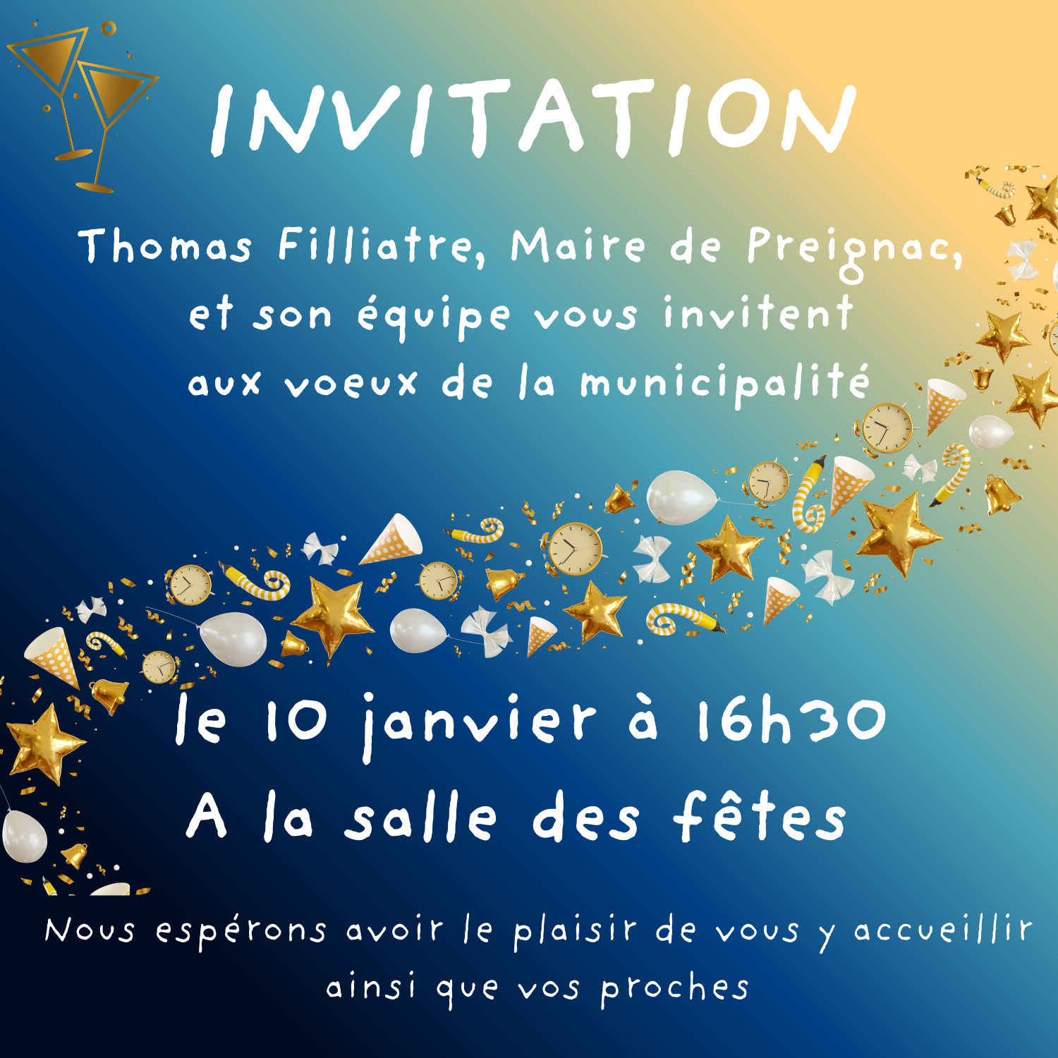 Invitation voeux de la Municipalité + Ajouter à mon Agenda Google + iCal / Outlook export 00 jours 00 heures 00 minutes 00 secondes Date 10 Jan 2026 Heure 16h30 - 18h30 Partagez cet événement