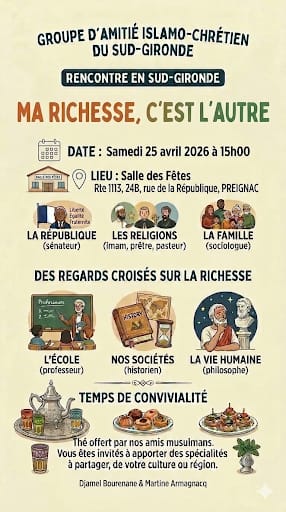 Rencontre en Sud Gironde : Ma richesse, c’est l’autre + Ajouter à mon Agenda Google + iCal / Outlook export 00 jours 00 heures 00 minutes 00 secondes Date 25 Avr 2026 Heure 15h00 - 18h00 Partagez cet événement