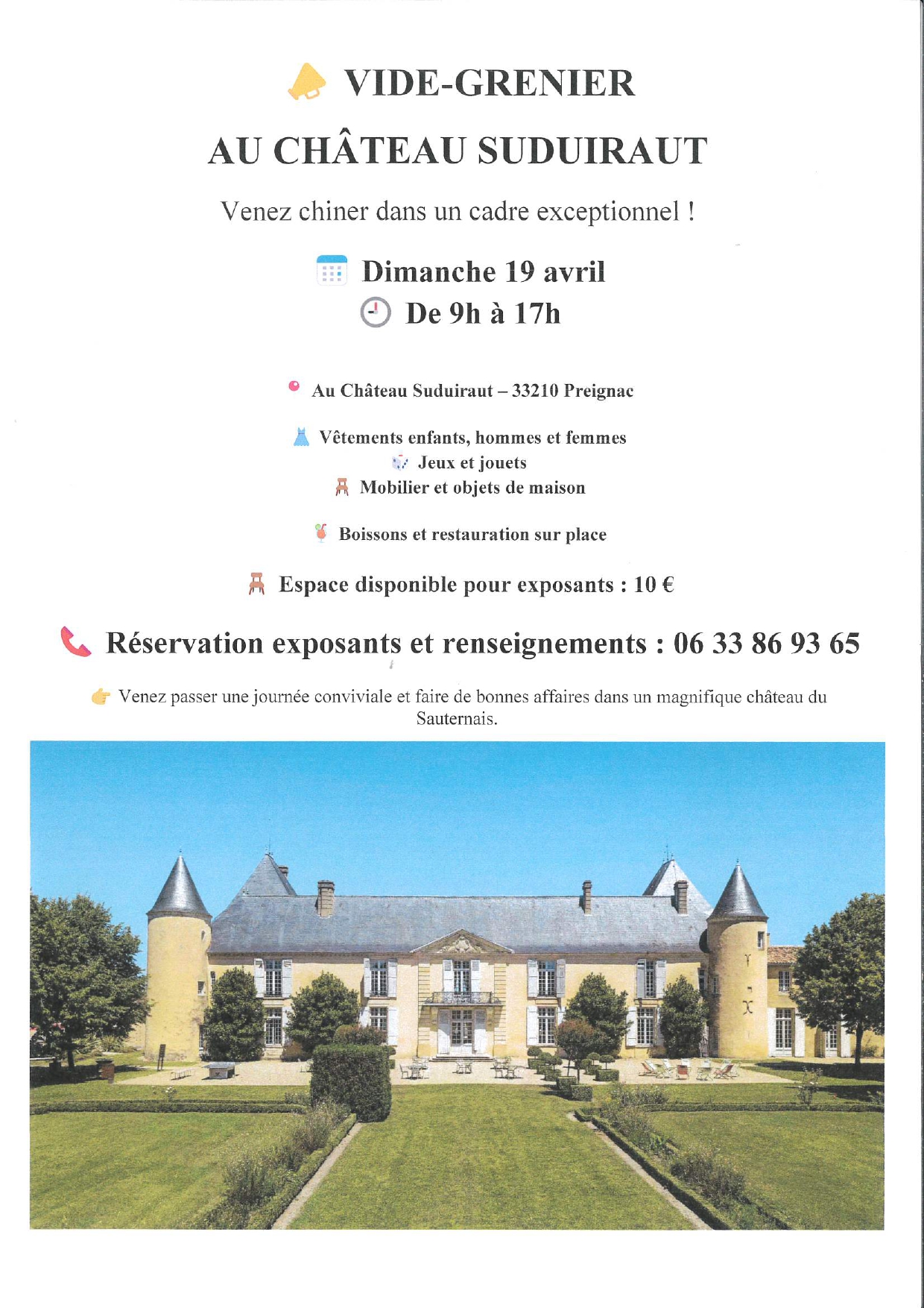 Vide grenier Château SUDUIRAUT + Ajouter à mon Agenda Google + iCal / Outlook export 00 jours 00 heures 00 minutes 00 secondes Date 19 Avr 2026 Heure 9h00 - 17h00 Partagez cet événement